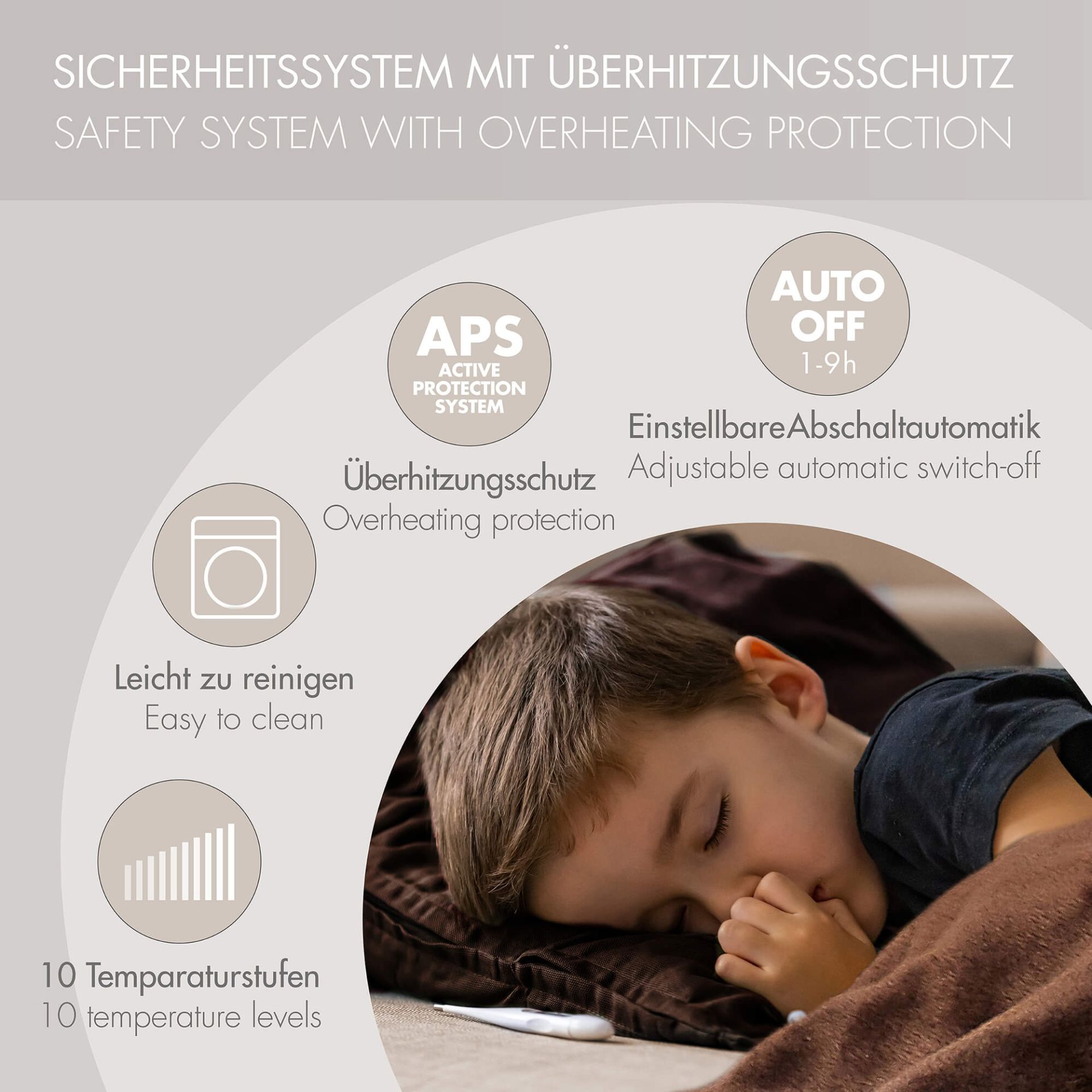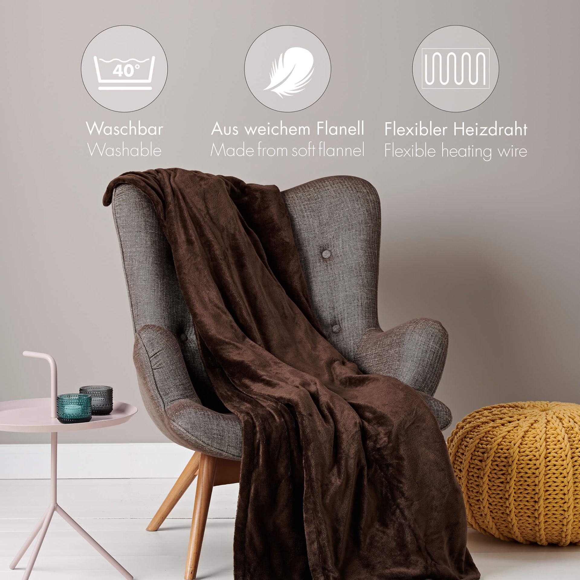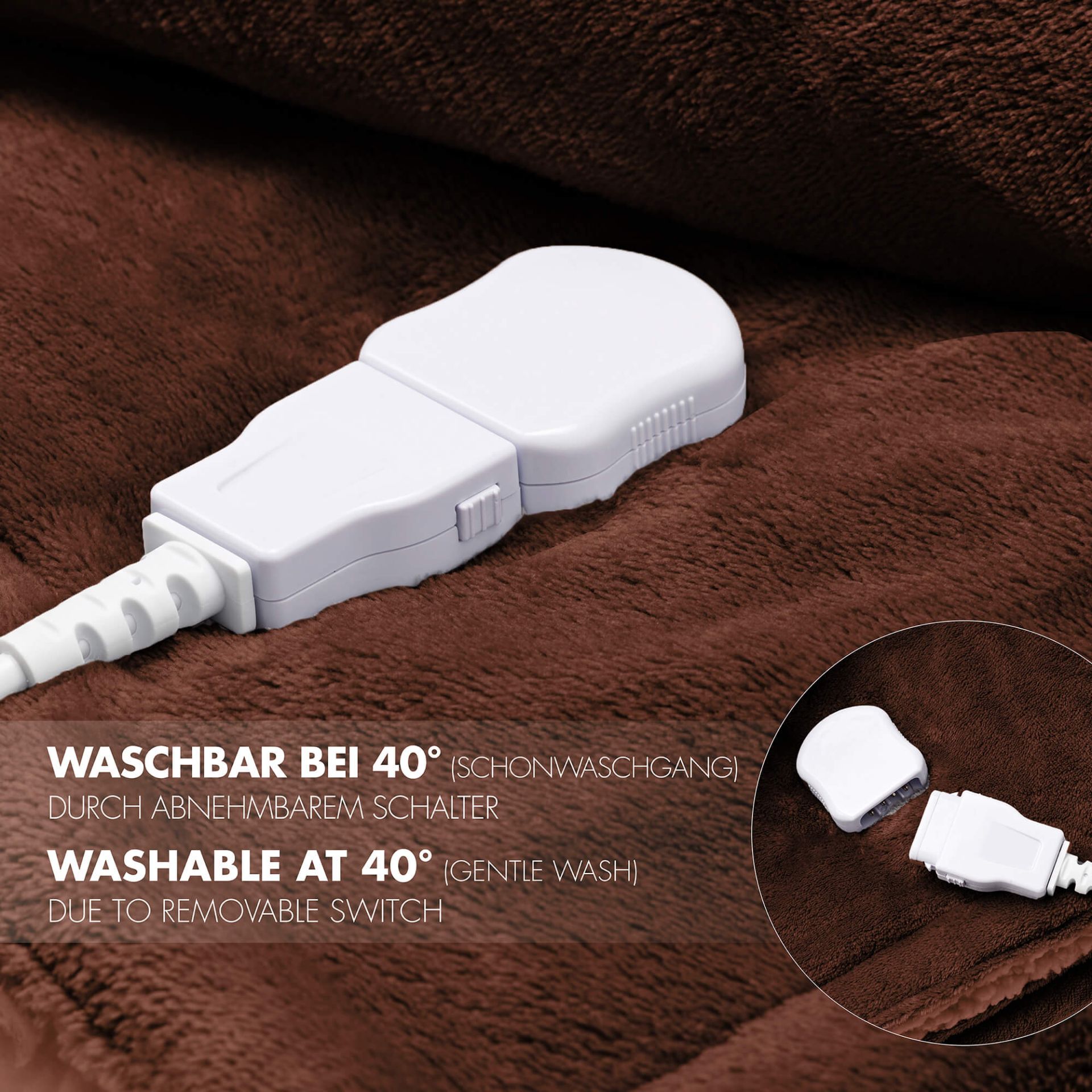 Das weiche, anschmiegsame Polyester-Flanell-Material sorgt für ein kuscheliges Gefühl auf der Haut und ist maschinenwaschbar bei 40 °C, da sich der Schalter einfach abnehmen lässt. Ein integriertes Sicherheitssystem mit Überhitzungsschutz gewährleistet sorgenfreies Wohlfühlen.