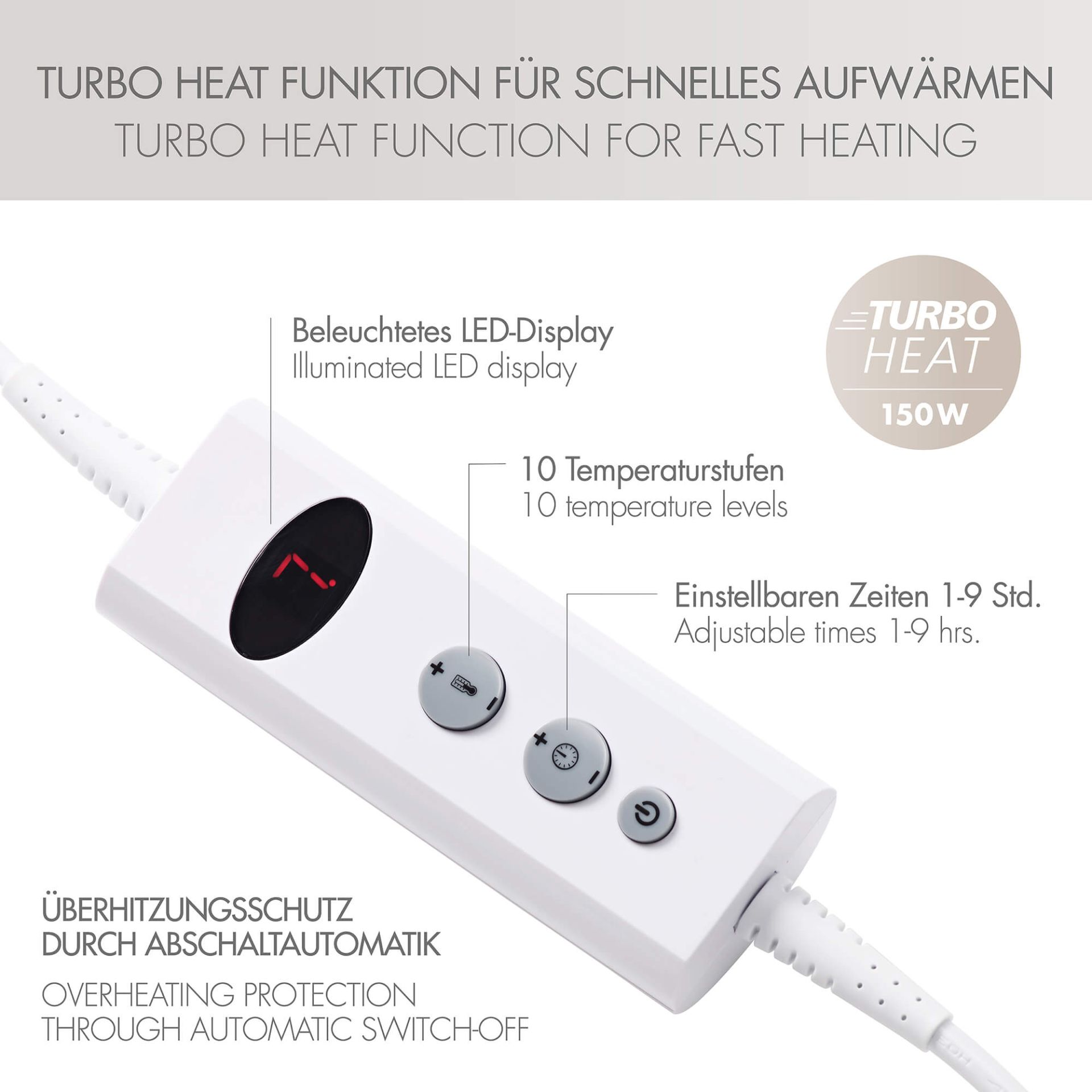 Dank Turbo-Heat-Technologie mit 150 Watt Leistung wird die Decke besonders schnell warm. Über das praktische Bedienelement mit beleuchtetem LED-Display wählen Sie ganz einfach zwischen 10 Temperaturstufen (1–9 + H) und stellen eine individuelle Heizdauer von 1 bis 9 Stunden ein. Die Decke schaltet sich danach automatisch ab – für Sicherheit und Komfort.