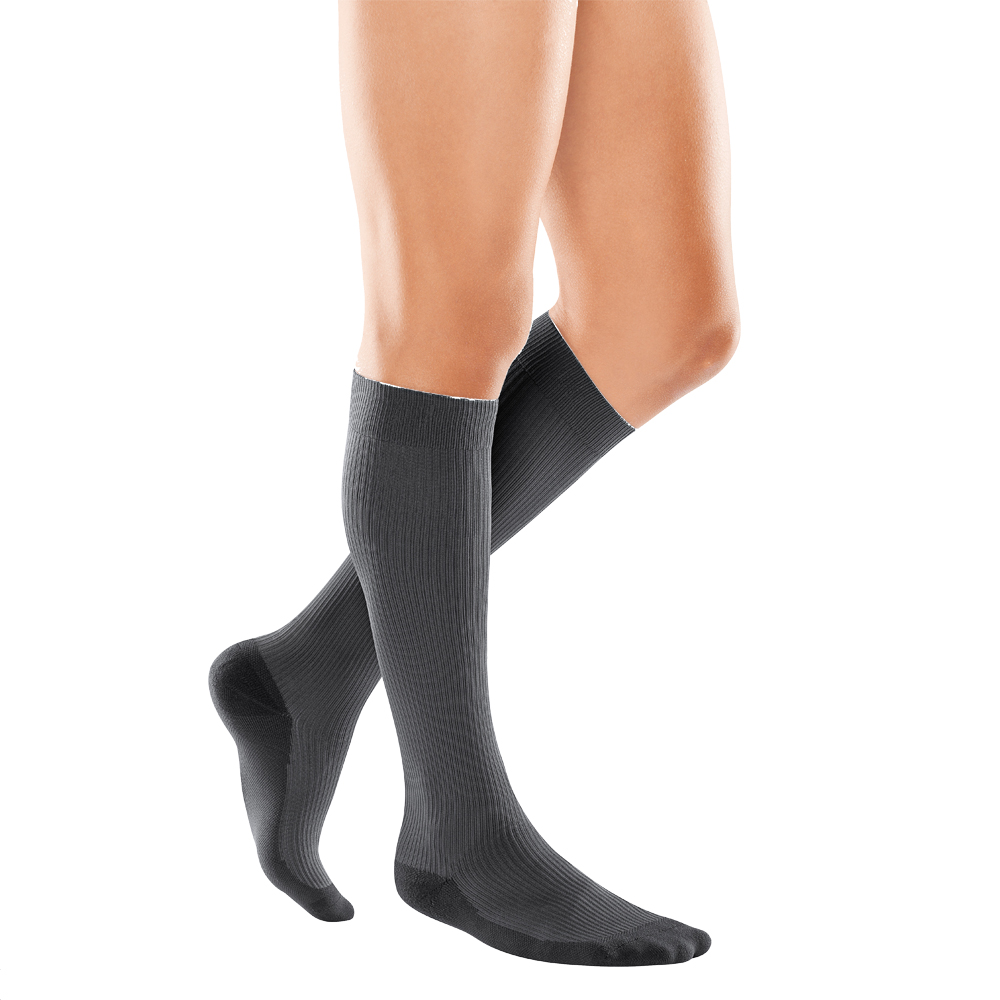 Der medi travel® men Reisekniestrumpf ist in den Farben Schwarz und Grau in attraktiver Rippenoptik erhältlich. Mit seinem sportlichen Design unterscheidet er sich nicht von gewöhnlichen Herrenstrümpfen.